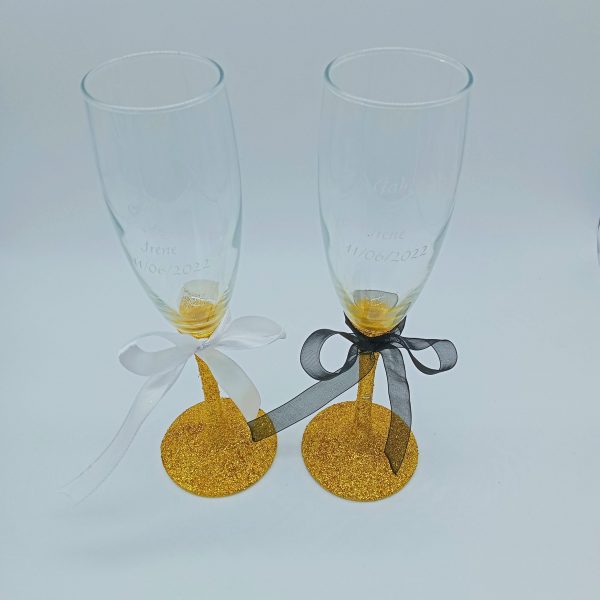 Puedes personalizar las copas con el color de purpurina que prefieras. Las copas van grabadas con los nombres de los novios y la fecha, con un dibujo de las alianzas como indica el ejemplo. Si quieres cualquier otra opción en la personalización, no dudes en contactar conmigo.