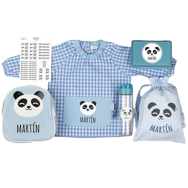 Todo personalizado con su nombre para no perderlo y un bonito dibujo de panda.