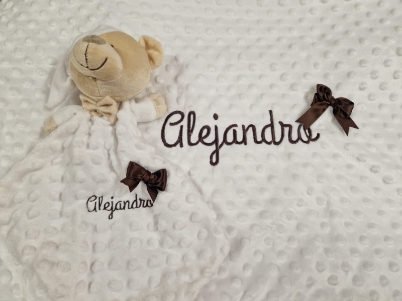 El nombre irá por defecto en la parte inferior y central de la manta y en la parte central del doudou.
